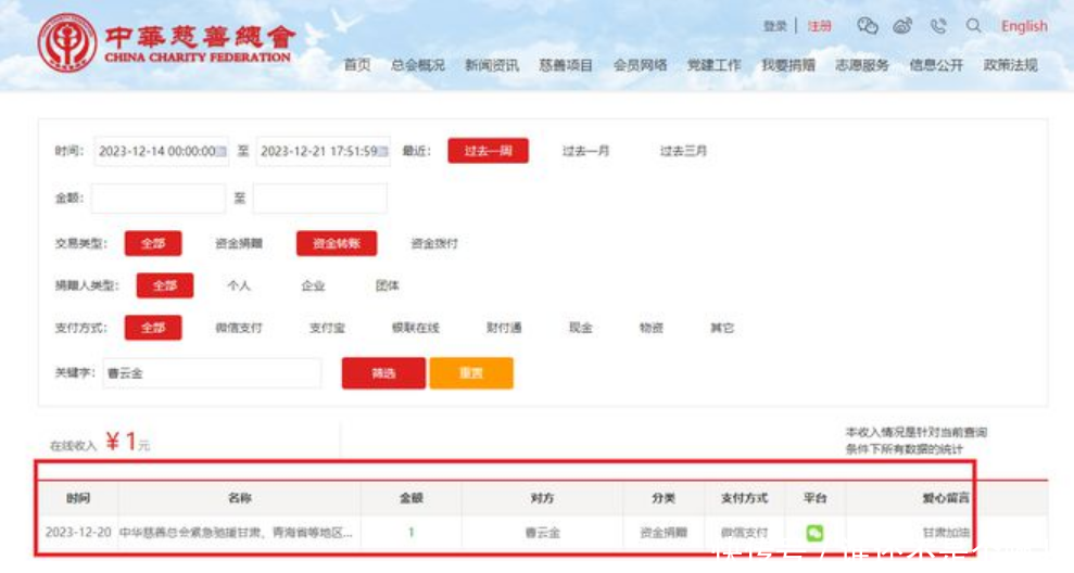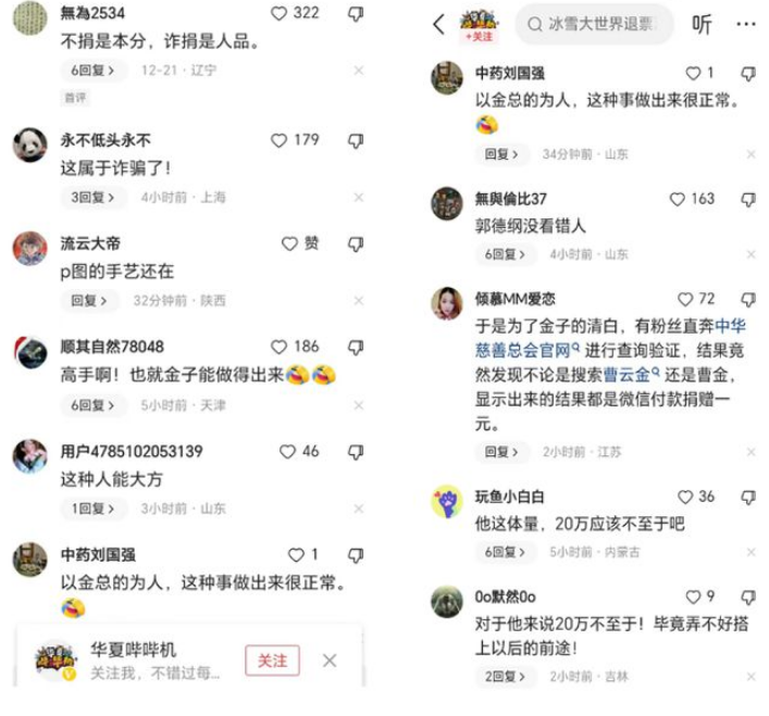 试问一下,甘肃、青海灾地东谈主民在冬天需要解救的技术,在曹云金为灾地捐钱20万元的技术,到底是什么样的东谈主会无视中华慈善总会官网信息,只是凭借一张谁皆不错制作的截图就质问曹云金诈捐?