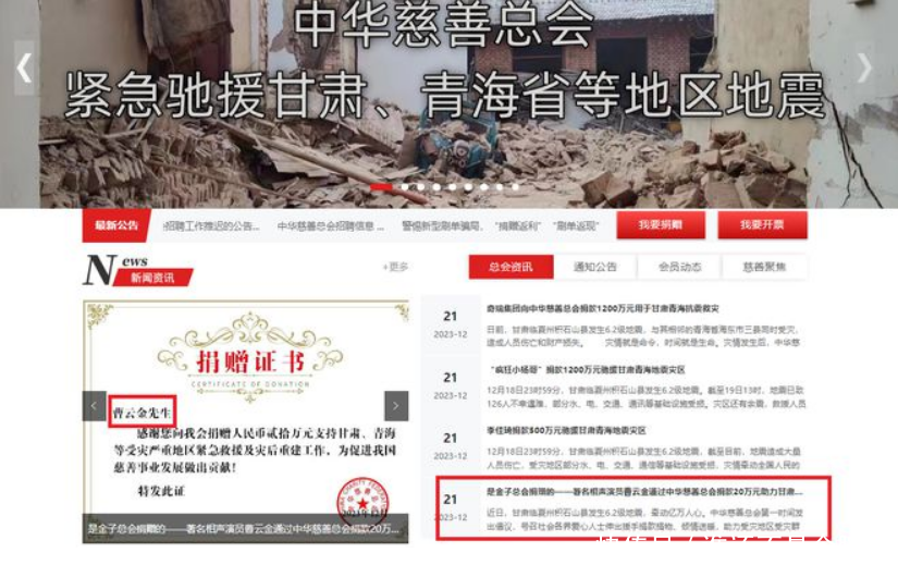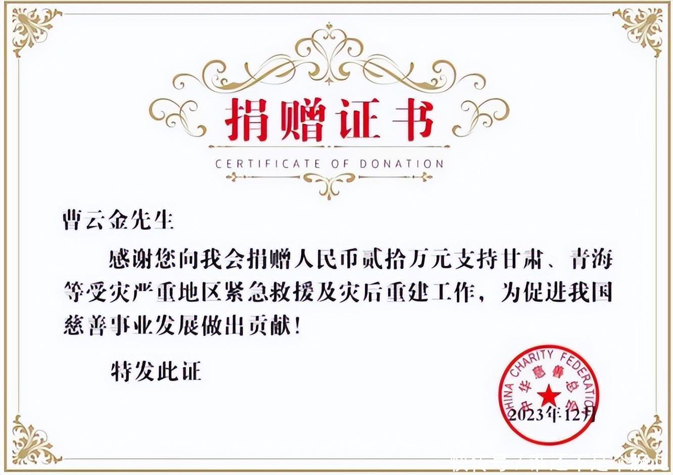 2023年12月底,曹云金通过个东谈主账号对外发布视频,文书我方也曾通过中华慈善总会为甘肃、青海地震灾地捐钱20万元,并晒出了中华慈善总会颁发的捐钱文凭。