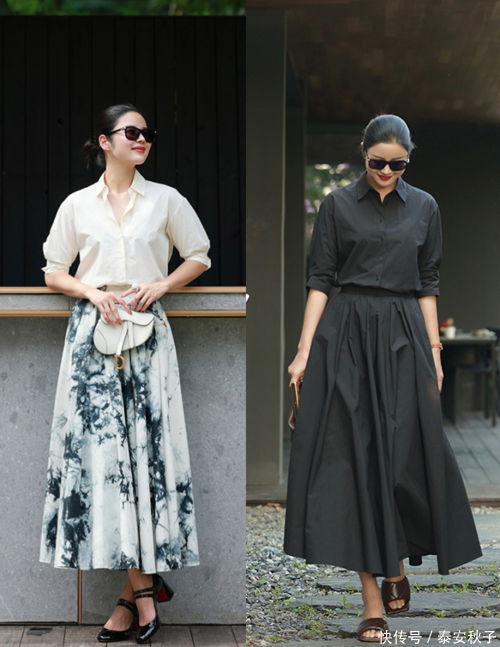 比如一条行走间灵动、超脱感满满的中长款半身裙,就是被她们通过塞下摆或者腰带等收腰时势,打造出张弛有度纯真放纵。