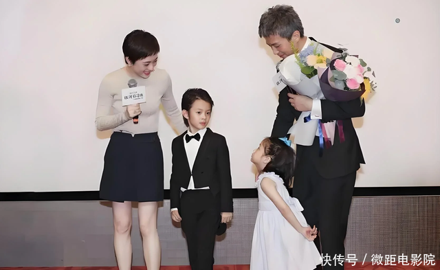 台上,孩子俩夸赞爸爸,妹妹评价电影很可笑,哥哥歌咏是爸爸拍过最佳的电影。