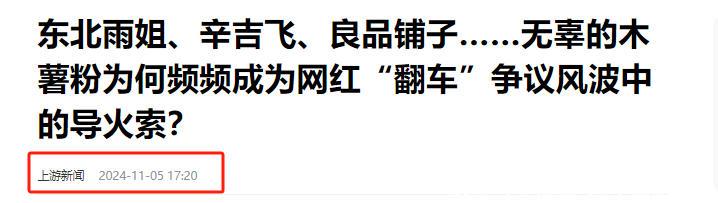 【2】2024年11月5日发布 官方媒体 上游新闻《东北雨姐、辛吉飞、良品铺子……无辜的木薯粉为何经常成为网红“翻车”争议风云中的导火索?》