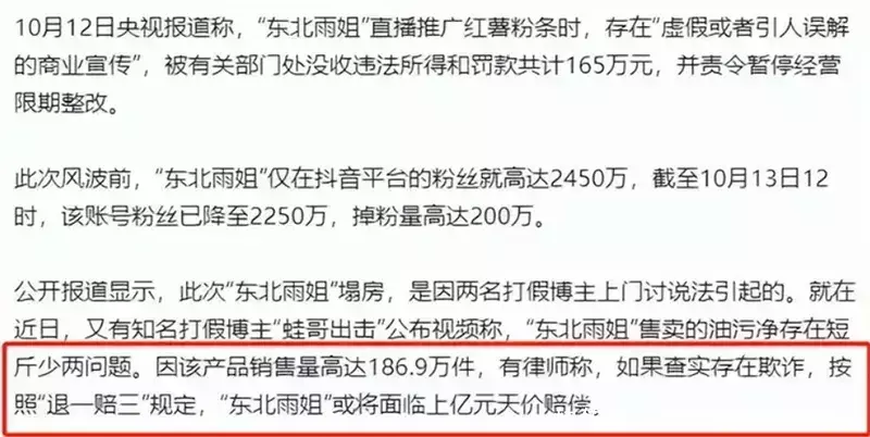 字据网友的举报,东北雨姐也濒临着“假一赔三”的赔付,再加上,这件商品的销售量高达186.9万件。
